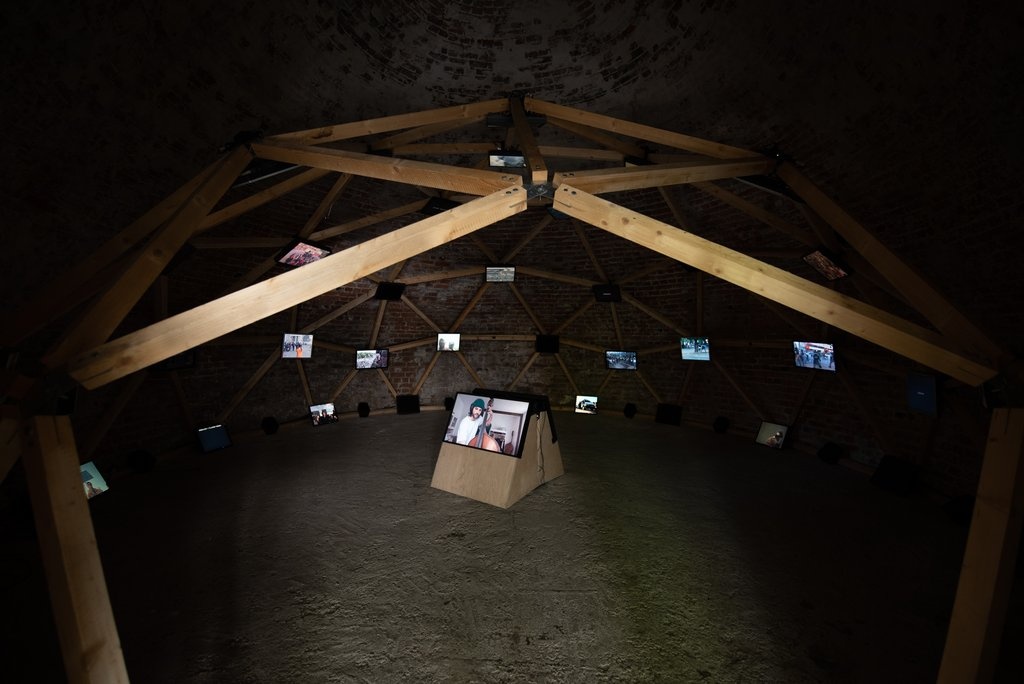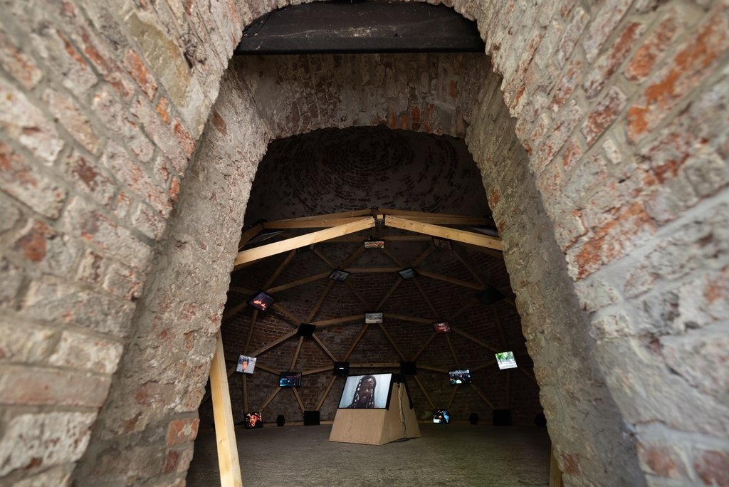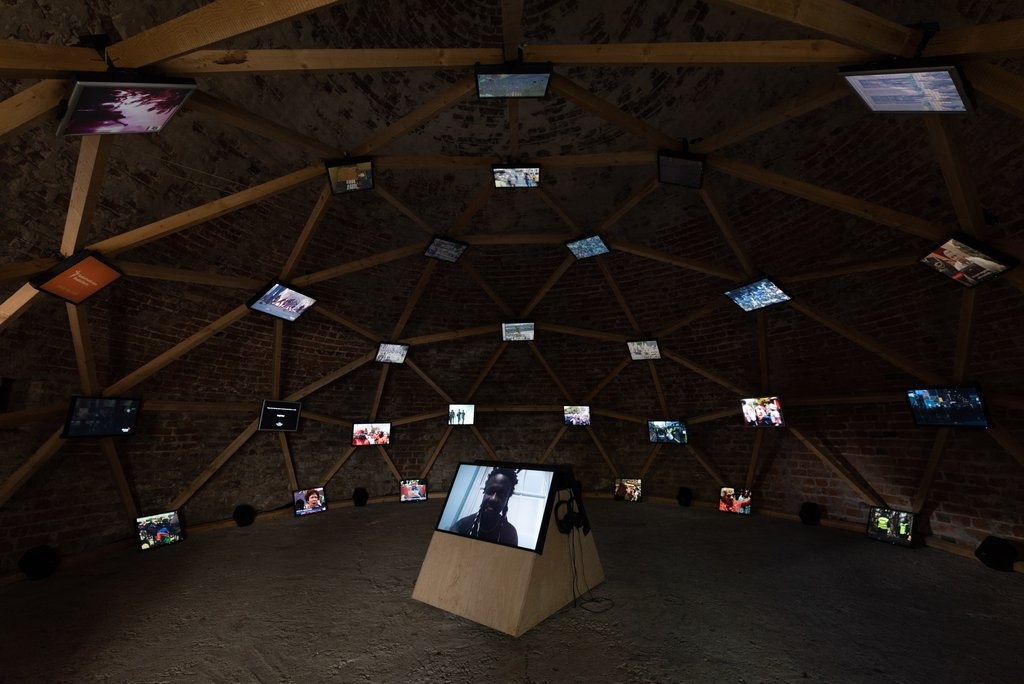 All the World’s Protests (Alle Proteste der Welt) ist eine komplexe Video- und Toninstallation des nigerianischen Künstlers Ayọ̀ Akínwándé, die eigens für den Pulverturm geschaffen wurde. Auf 40 Monitoren laufen Nachrichtenvideos über zahllose Demonstrationen, die 2019, im „Jahr der Proteste“, in der internationalen Berichterstattung auftauchten. Auf 12 Tonspuren hört man eine Komposition aus den O-Tönen der Proteste und dazu improvisierte, musikalische Jam Sessions als künstlerische Reaktion darauf. Die Arbeit ist Teil des langfristig angelegten Projektes Archiving the Future, das sich, ausgehend von der politischen Situation in Nigeria, mit Körper und Stimme im öffentlichen Raum und dem Verhältnis von „Mächtigen“ und „Machtlosen“ beschäftigt. Die Installation im Pulverturm, die in der Isolation der pandemischen Lockdowns geschaffen wurde, bezeichnet Akínwándé auch als Situation Room (Lagezentrum), in dem wir hinter den meterdicken Mauern des Pulverturms beobachten, wie die Welt aus den Fugen gerät.