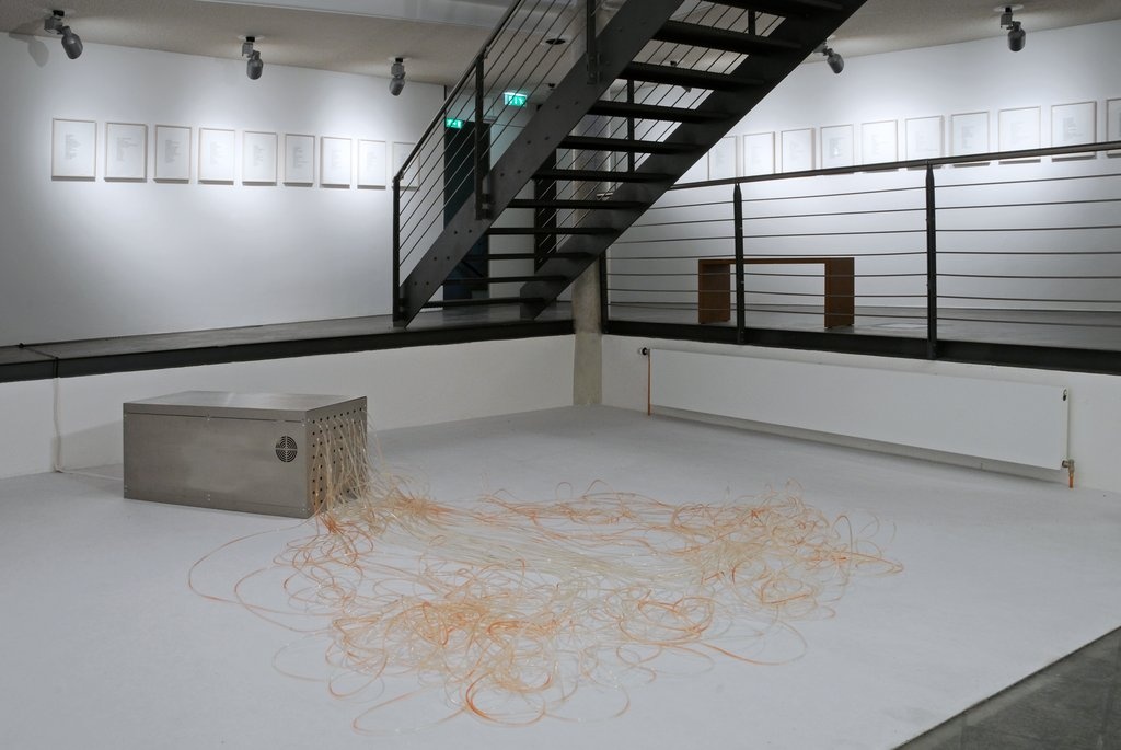 Diese kleinsten Informationseinheiten sind in der Installation ebenso flüchtig wie die Geschwindigkeit, mit der in der Mediengesellschaft Informationen gewonnen, ausgetauscht und aktualisiert werden. Weitere Arbeiten in der Ausstellung wie bit.flow oder bit.code verwenden andere Materialien, Formen und Verfahren, machen aber wie bit.fall Kommunikationsprozesse und die Transformation von Information sicht- und nachvollziehbar.