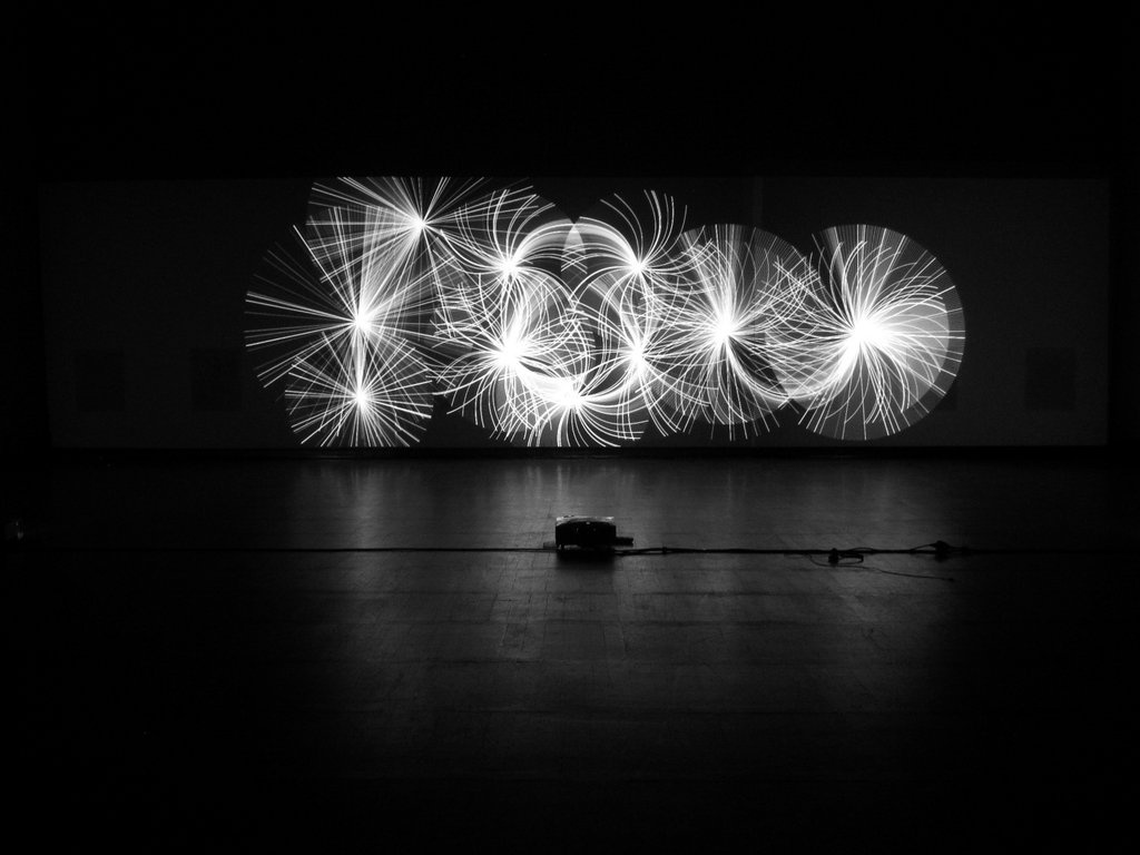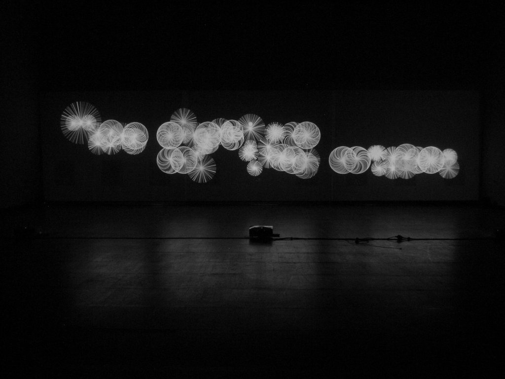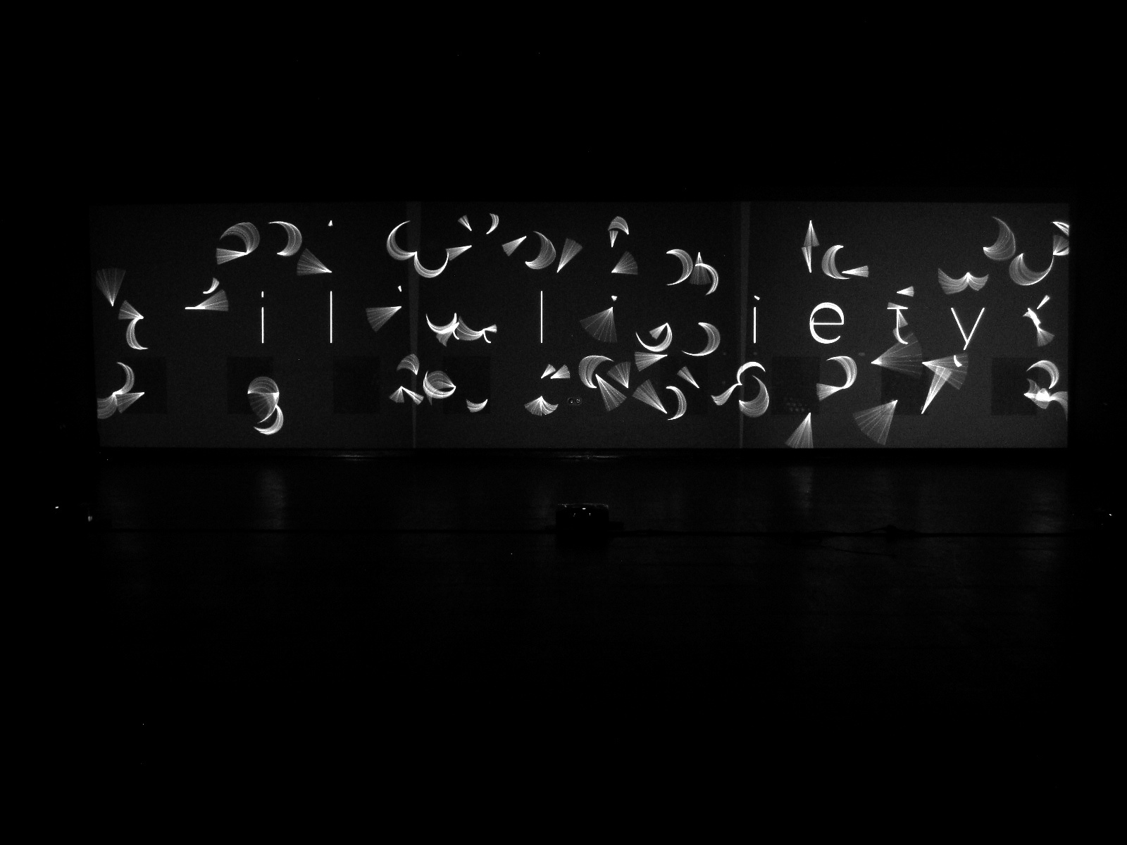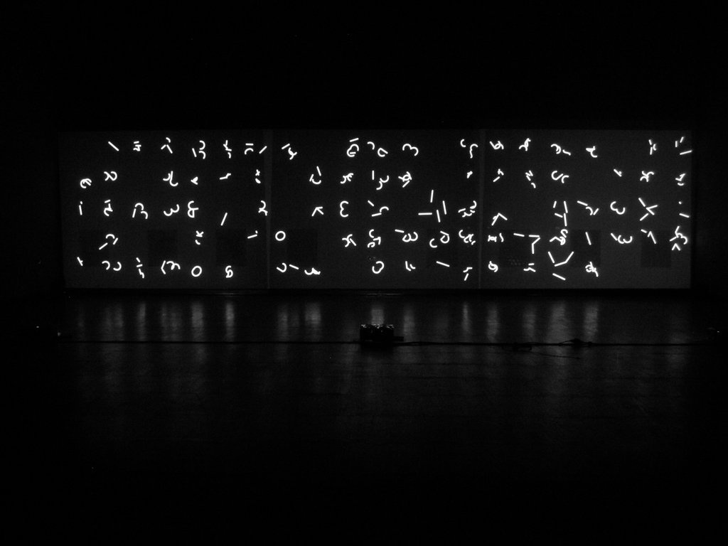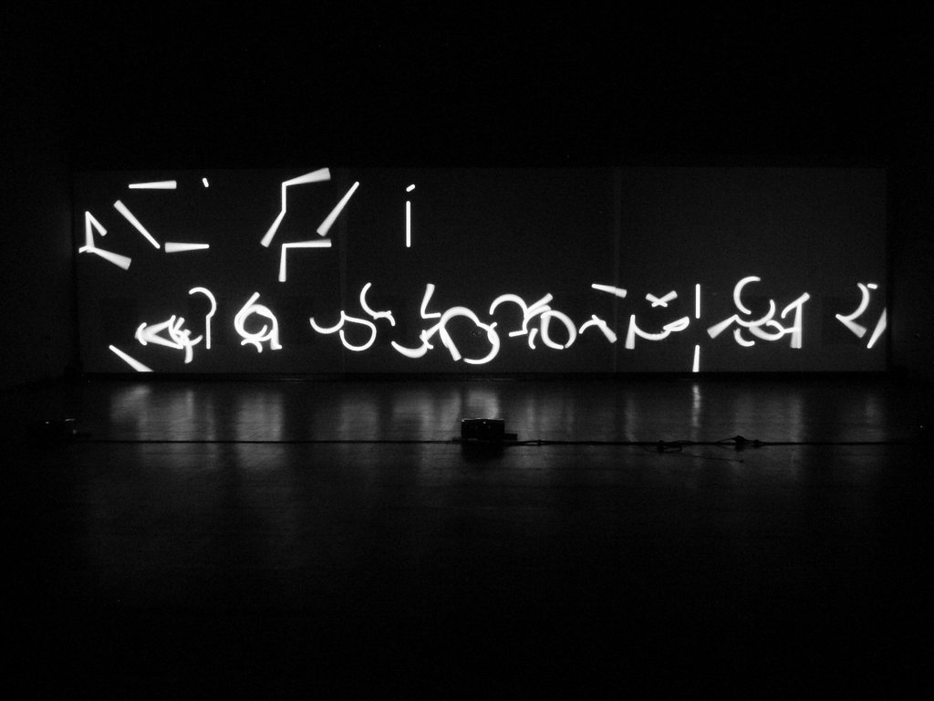 In der Installation von ss-io, deren Mitglieder aus Korea stammen und in Berlin und Seoul leben und arbeiten, werden Buchstaben des lateinischen Alphabets spielerisch demontiert und zum Tanzen gebracht. In einer Drei-Kanal-Projektion entsteht ein abstraktes Buchstabenballett aus sinnlosen Wortfolgen, die sich immer wieder zu nicht lesbaren Zeichen verändern, die dennoch an Schrift erinnern. Die zentrale Klangebene strukturiert die Bewegung der klaren Formen und lädt BetrachterInnen ein, sich selbst körperlich in ein Verhältnis zu den Zeichenabstraktionen zu setzen.