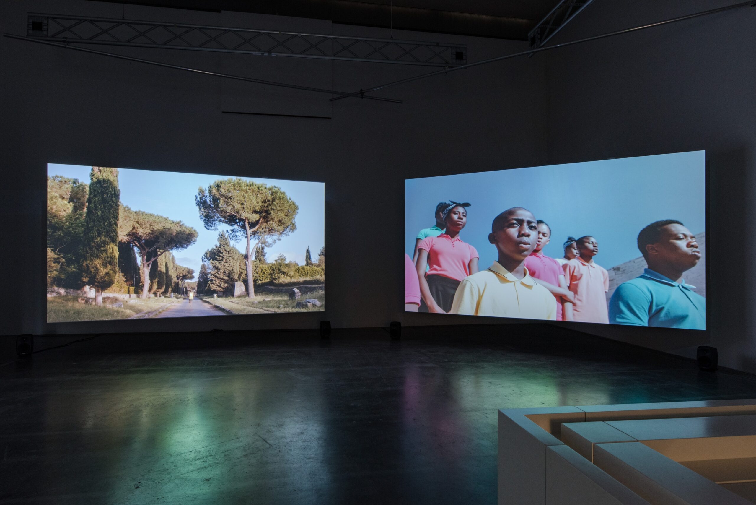 Fischer & Sanis großformatige Videoinstallation Freedom of Movement (2017) erinnert an den Marathonlauf der Olympischen Sommerspiele 1960 in Rom, bei dem der äthiopische Athlet Abebe Bikila die erste Goldmedaille für den afrikanischen Kontinent gewann, obwohl er die Strecke barfuß gelaufen war; er wurde zu einer Sportlegende und zu einem Symbol für das moderne Afrika, das sich vom Kolonialismus befreite. Fischer & el Sani haben im Kontext der rationalistischen Architektur Roms einen neuen Wettbewerb mit Geflüchteten und Migrant*innen realisiert und damit deren Anspruch auf „Bewegungsfreiheit“ angemeldet, der auch als Möglichkeit zu verstehen ist, in einem anderen Land willkommen geheißen zu werden.
