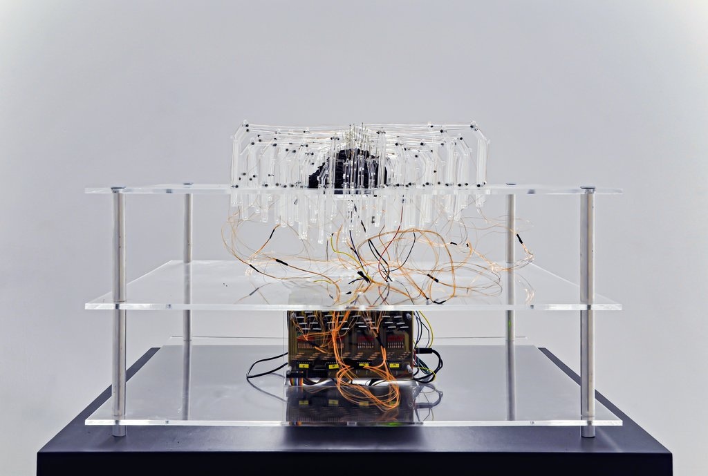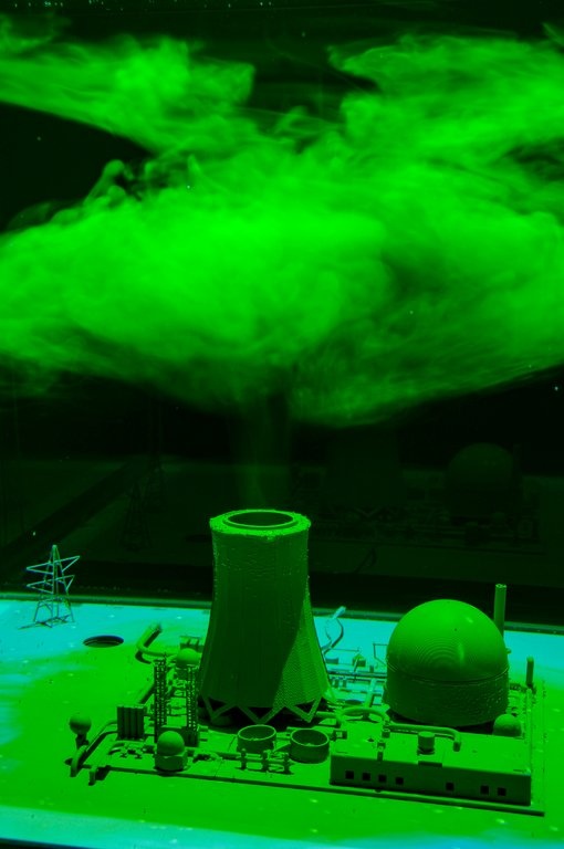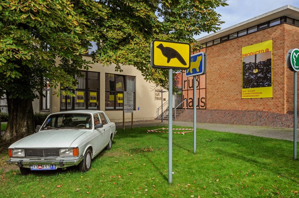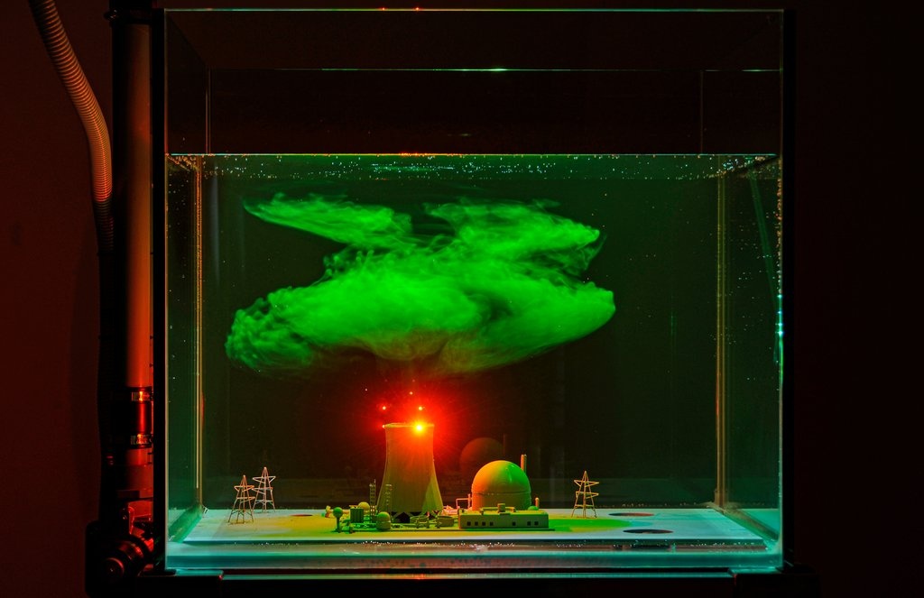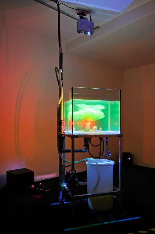Davon zeugen exemplarisch die fünf jüngsten Stipendienprojekte, die in der Ausstellung ausführlich gezeigt werden. Von Jana Linkes gewaltiger Maschine, deren Zweck es ist, sich selbst einzugraben, um dann von einem Angestellten wieder ausgegraben und für das nächste Eingraben vorbereitet zu werden, bis zu Ralf Baeckers Kristall, der von 64 Armen elektronisch angeregt wird und selbstständig leuchtet. Von REINIGUNGSGESELLSCHAFTS soziologischer Castingshow-Befragung Oldenburger Jugendlicher zu ihren Zukunftsvorstellungen über HeHes miniaturisierte Simulation eines Atompilzes nach einer Reaktorkatastrophe in einem Wasserbecken bis zu Anahita Razmis Überführung eines Autos, eines Paykans, aus Teheran nach Oldenburg und der Darstellung dieser transformativen Fahrt in einem elfstündigen Film.