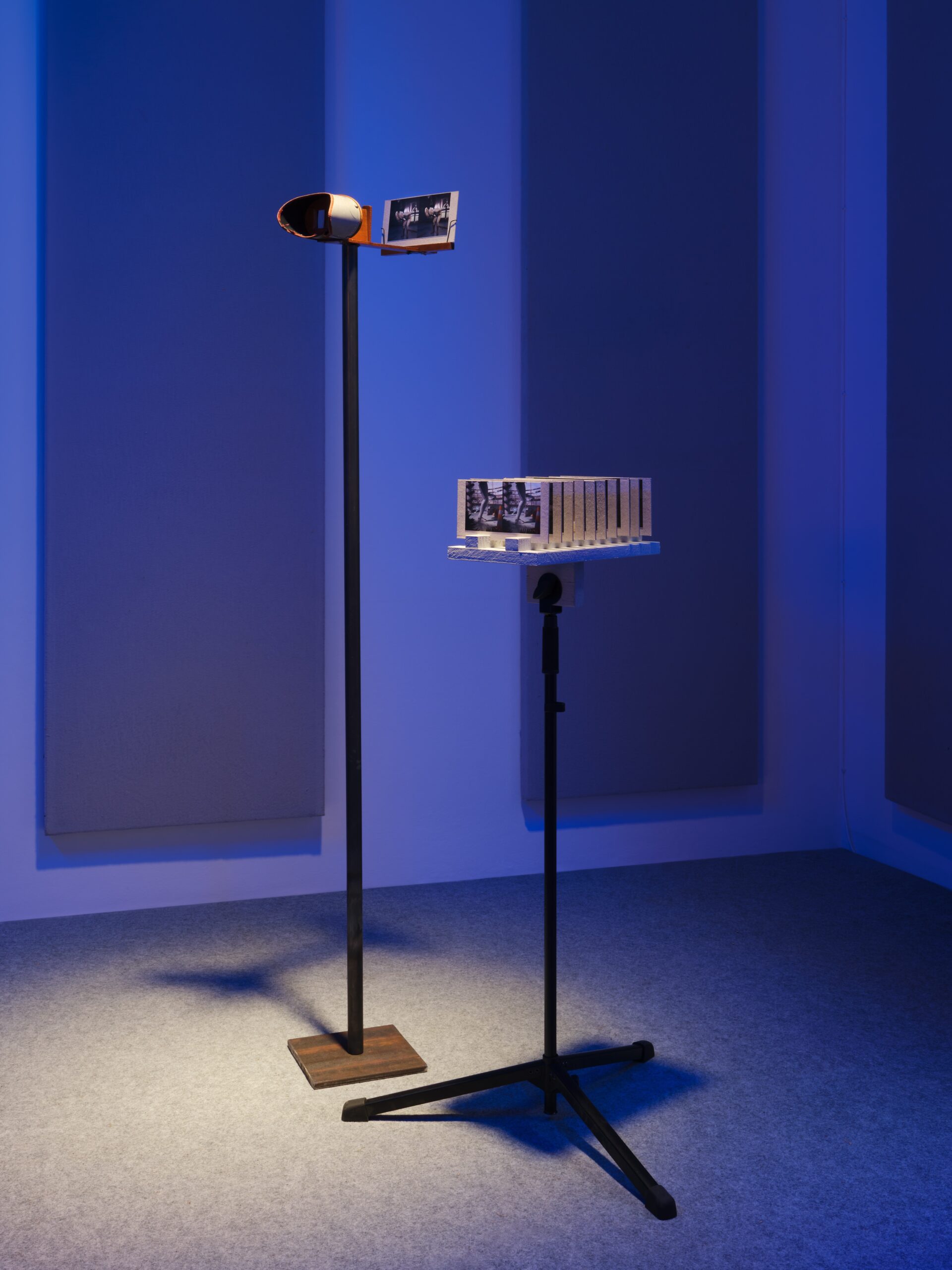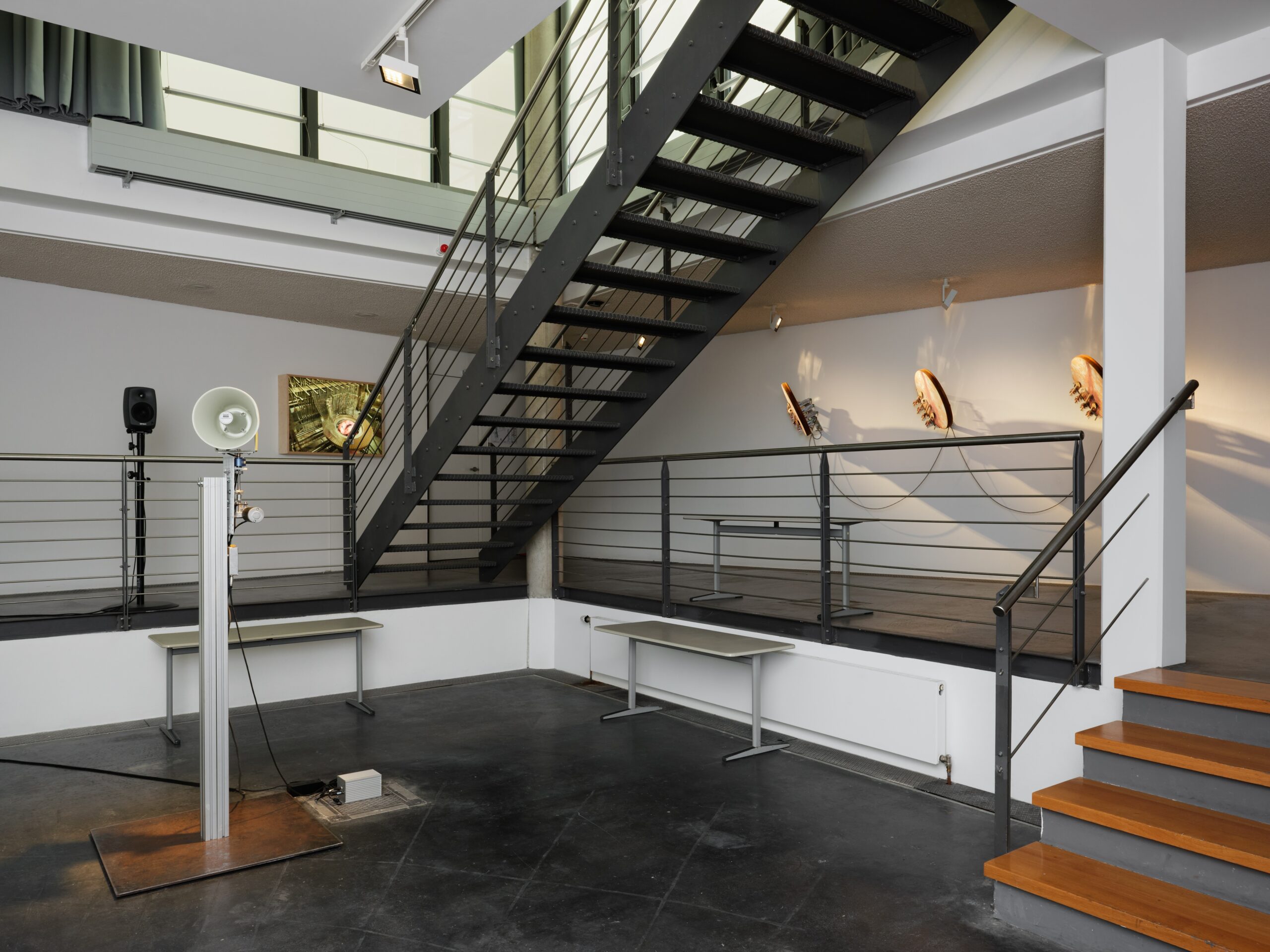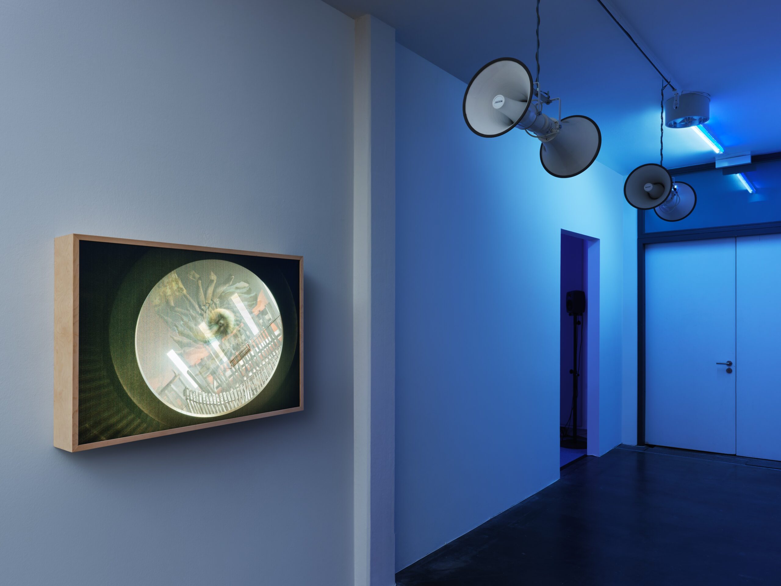 Ein System aus interagierenden Klangzonen und vernetzten Installationen, das sich über die beiden Etagen des Edith-Russ-Hauses erstreckt, dient als strukturierende Partitur, um die Bewegung des Publikums durch den Raum zu lenken, aber auch als dramaturgische Markierung der Intensitäten dieser Arbeit. Dabei wird der reale Raum des Edith-Russ-Hauses zu einer Erweiterung der architektonischen Räume, die Hamadeh ursprünglich für die 3D-modellierten Welten des ersten Kapitels von Standard_Deviation entworfen hatte. Ein Netzwerk aus programmierten Geräten greift in dieses akustische und visuelle System ein und bildet eine Brücke zwischen den Maschinen, die im Animationsfilm und in der Realität des Ausstellungsraums funktionieren. Die Ausstellung ist kakophonisch und immersiv und beruht auf miteinander verflochtenen erzählerischen, affektiven und maschinellen Operationen.