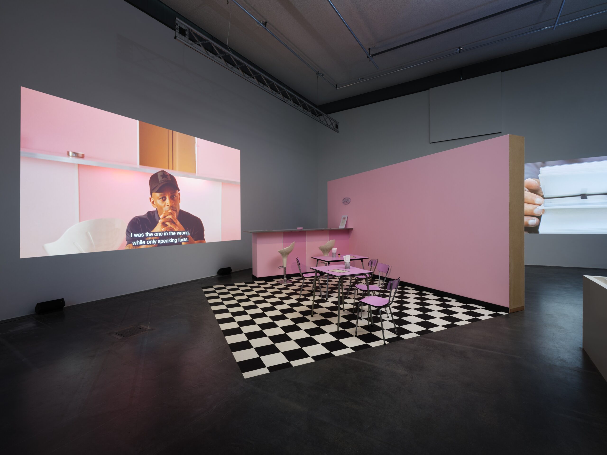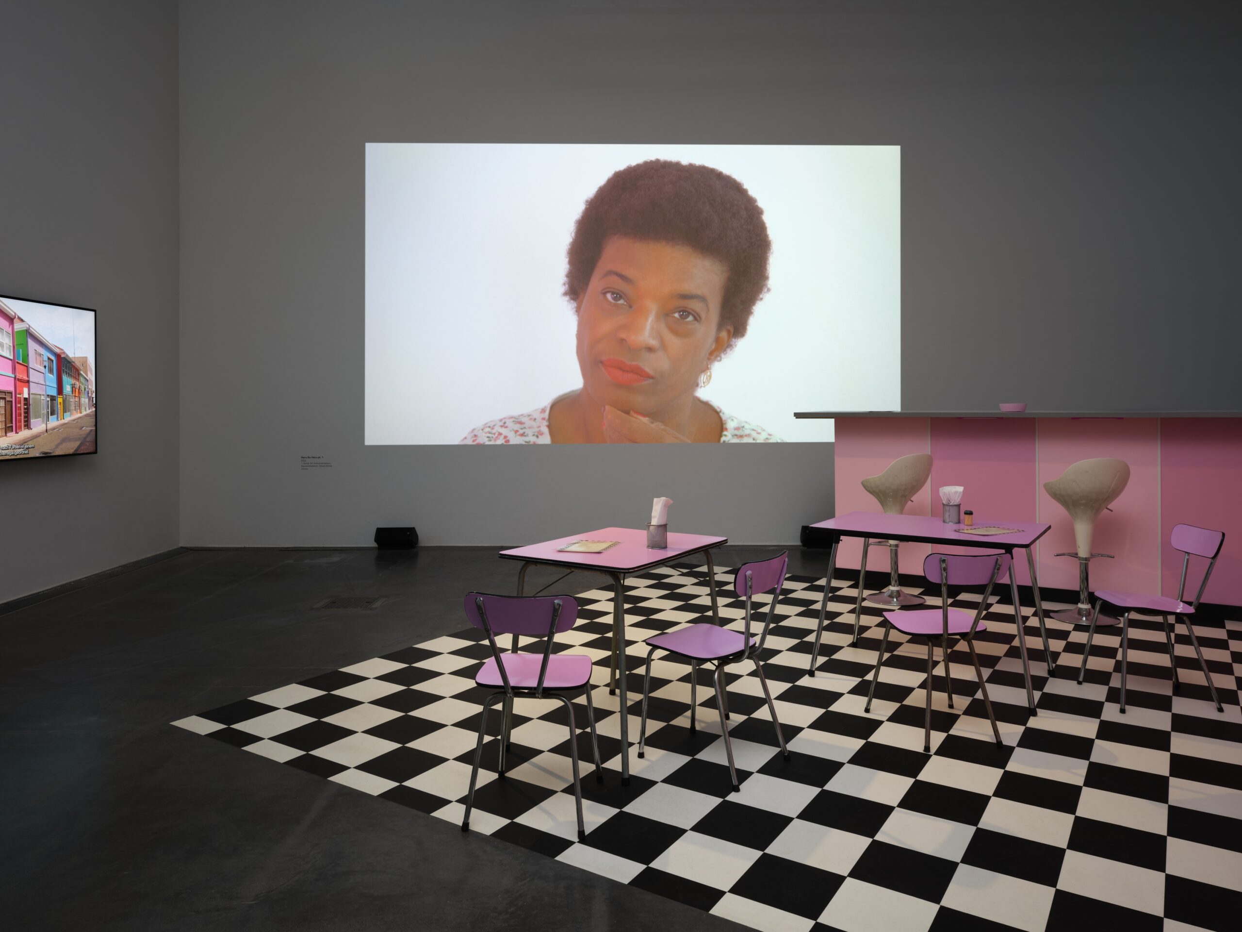 Mit Fotografien, Voice-over und schnellen Schnitten, die sie in das Filmmaterial einfügt, trägt sie der Tatsache Rechnung, dass jede Geschichte Bezüge zu anderen Geschichten enthält – von denen die meisten unausgesprochen bleiben und nicht erzählt werden. Martesʼ neue Multimedia-Installation Heru Ku Heru pt. 1 von 2023, die im Auftrag des Edith-Russ-Hauses entstand, beruht auf einer dieser noch nie erzählten Geschichten. Sie ist inspiriert von den Reiserouten, die die Familie der Künstlerin unternommen hat. Die Arbeit beschäftigt sich mit der komplexen Geschichte der Nachkommen von Menschen, die von der karibischen Insel Curaçao in die Niederlande ausgewandert sind, und verbindet zwei verschiedene Formate. Sie besteht aus einer fiktionalen Story, die Protagonistinnen und Protagonisten beim Besuch eines curaçaischen Imbiss zeigt, und nichtfiktionalen Interviews mit niederländischen Bürgerinnen und Bürgern, die karibische Wurzeln haben. Heru Ku Heru pt. 1 taucht ein in ihre mythologischen Erinnerungen und untersucht das heikle, komplexe Erbe des Kolonialismus aus einer heutigen Perspektive.