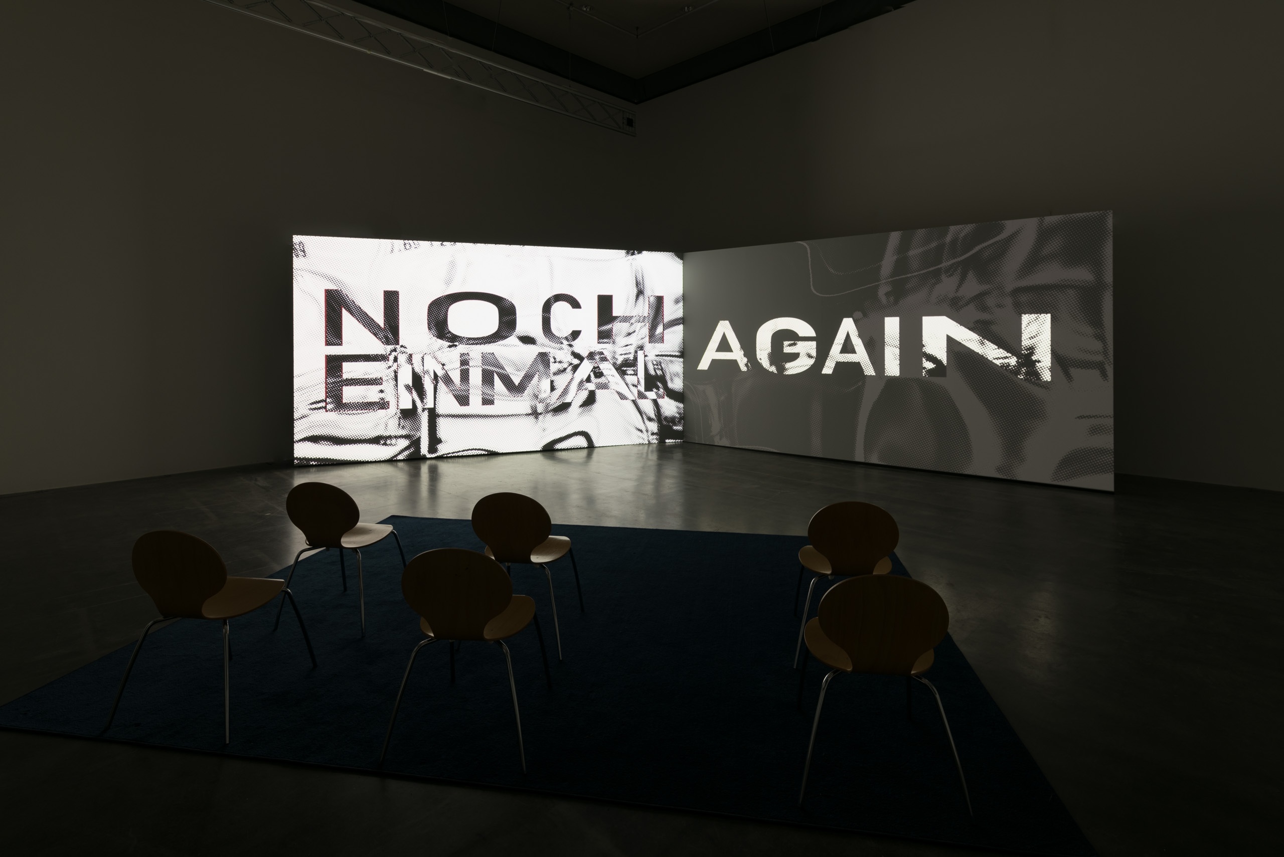 In der großen Halle des Edith-Russ-Hauses eröffnet die Ausstellung mit der großformatigen Installation Again/Noch Einmal von 2018, die sich mit einem Vorfall in der Nähe von Dresden 2016 auseinandersetzt, bei dem Shabaz al-Aziz, ein kurdisch-irakischer Geflüchteter, nach einem Streit mit einer Supermarktkassiererin attackiert und von vier ortsansässigen Männern an einen Baum gefesselt wurde. Bevor der Prozess gegen die vier Männer begann, wurde al-Aziz in einem Wald tot aufgefunden. Pfeifer rekonstruierte das virale YouTube-Filmmaterial des Angriffs auf Shabaz al-Aziz mit der Schauspielerin Dennenesch Zoudé und dem Schauspieler Mark Waschke und lud Menschen verschiedener Nationalitäten – die überwiegend als Migrantinnen und Migranten in Deutschland leben – dazu ein, als Geschworene aufzutreten und Fragen zu unserer Realitätswahrnehmung, zu Medienmanipulationen, zur Justiz sowie zu Gerechtigkeit und Demokratie zu stellen. Das Ausstellungspublikum wird virtuell Bestandteil dieser Jury und ist so aufgefordert, sich selbst ein Bild von den Ereignissen zu machen.