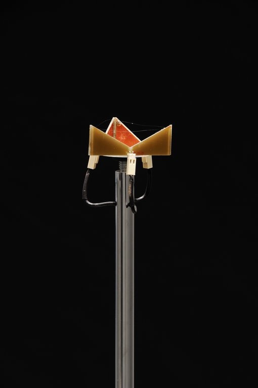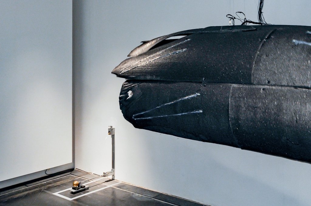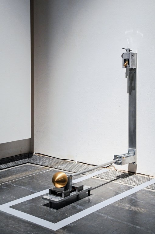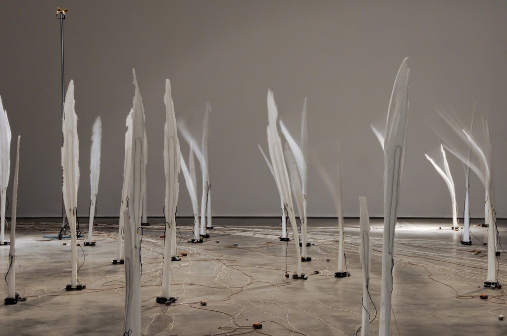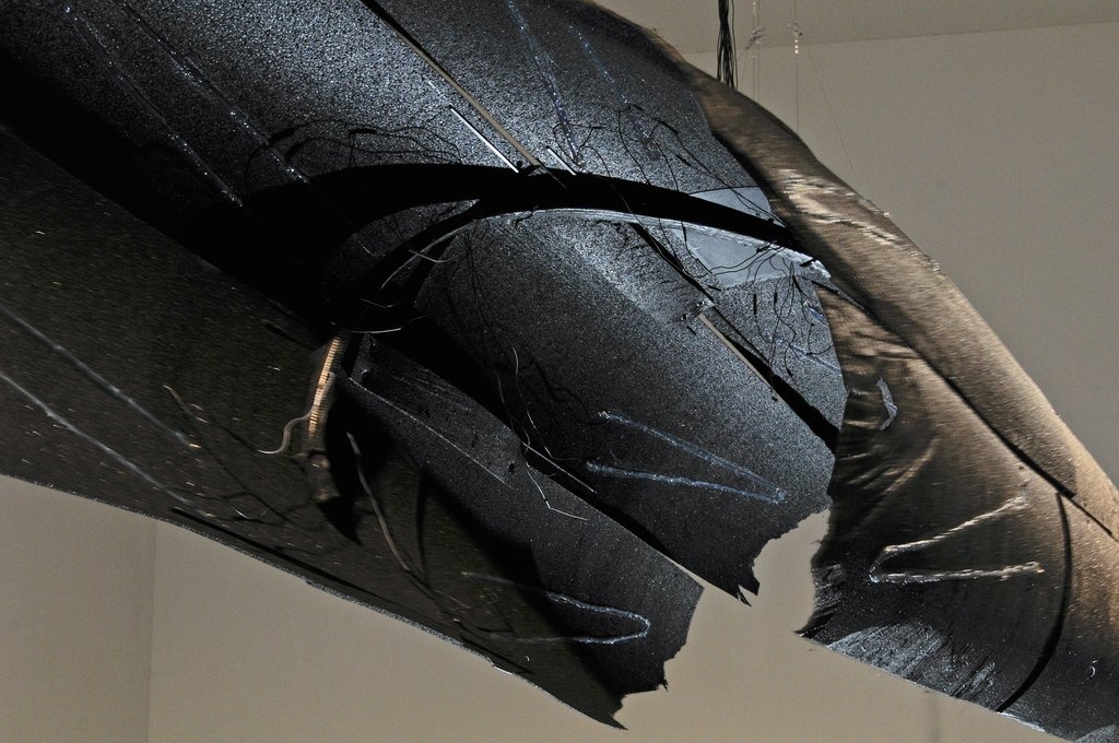 Den künstlerischen Materialstudien Yunchul Kims stehen die fragilen Rauminstallationen Kerstin Ergenzingers gegenüber. Die Arbeit Whiskers in Space, die vis á vis der Effulge im zentralen Eingangsraum des Edith-Russ-Hauses präsentiert wird, lässt an die feinfühligen Schnurrhaare von Katzen denken. Fedrig-leicht anmutende Gebilde ragen in die Höhe und bilden eine bewegliche Landschaft, die feinste Luftbewegungen misst und ihrerseits in kinetische und akustische Reaktionen übersetzt.