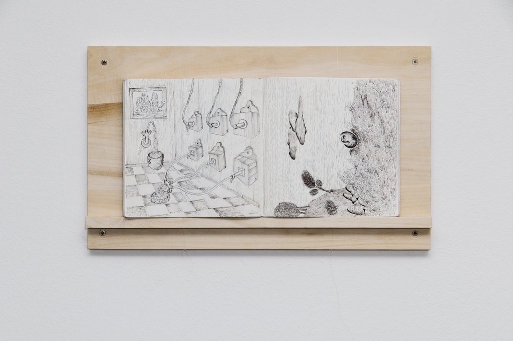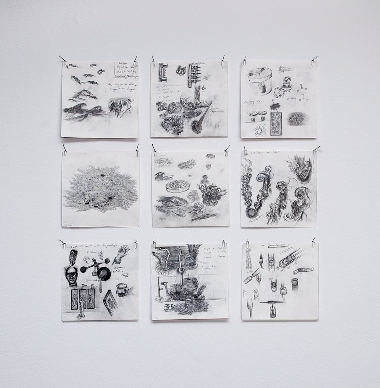 Ergänzt werden die Arbeiten beider KünstlerInnen durch die Präsentation von Zeichnungen, die auf dem Weg der künstlerischen Fertigung entstanden sind oder die Arbeiten im Nachhinein kommentieren.