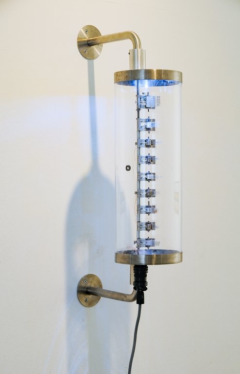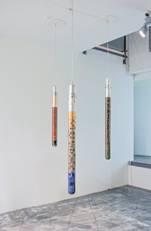 In Yunchul Kims jüngster Arbeit Flare, die durch ihr ungewöhnlich extremes Querformat von 15 x 300 cm sofort ins Auge sticht, reagiert die flüssige Oberfläche auf elektromagnetische Felder und Licht. Hinter der an einen Sehschlitz erinnernde Tafel setzt sich eine gestaltlose Masse in Bewegung, die an Staubscheiben um Sterne oder interstellare Nebel erinnert und alchemistischen Experimenten oder Zauberei zu entstammen scheint. Dass es sich um genaue naturwissenschaftliche Forschung handelt, zeigt der Künstler in einem Labor in den Ausstellungsräumen, das in Workshops auch zum aktiven Ort des Experimentierens und Forschens wird.