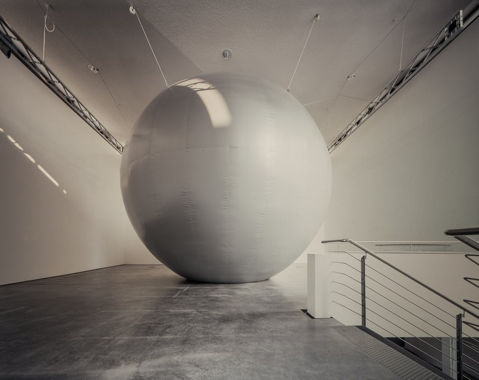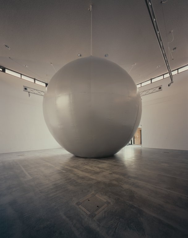Its basis is an interest in the micro-sounds which travel through the materials surrounding us, in this case the sound of the earth itself. Modified seismic sensors pick up the normally unheard movements of the earth and are channeled through the entire building until reaching a ‘crescendo’ in Bain’s sonusphere. Unique in its purpose and design, the sonusphere is essentially a wired, inflatable ball that fills the entire upper floor and takes signals generated from an acoustic network running through the entire architecture. It acts as a low frequency, 360 degree, acoustic radiator translating the sound to its curved walls as physically pulsating sound pressure.