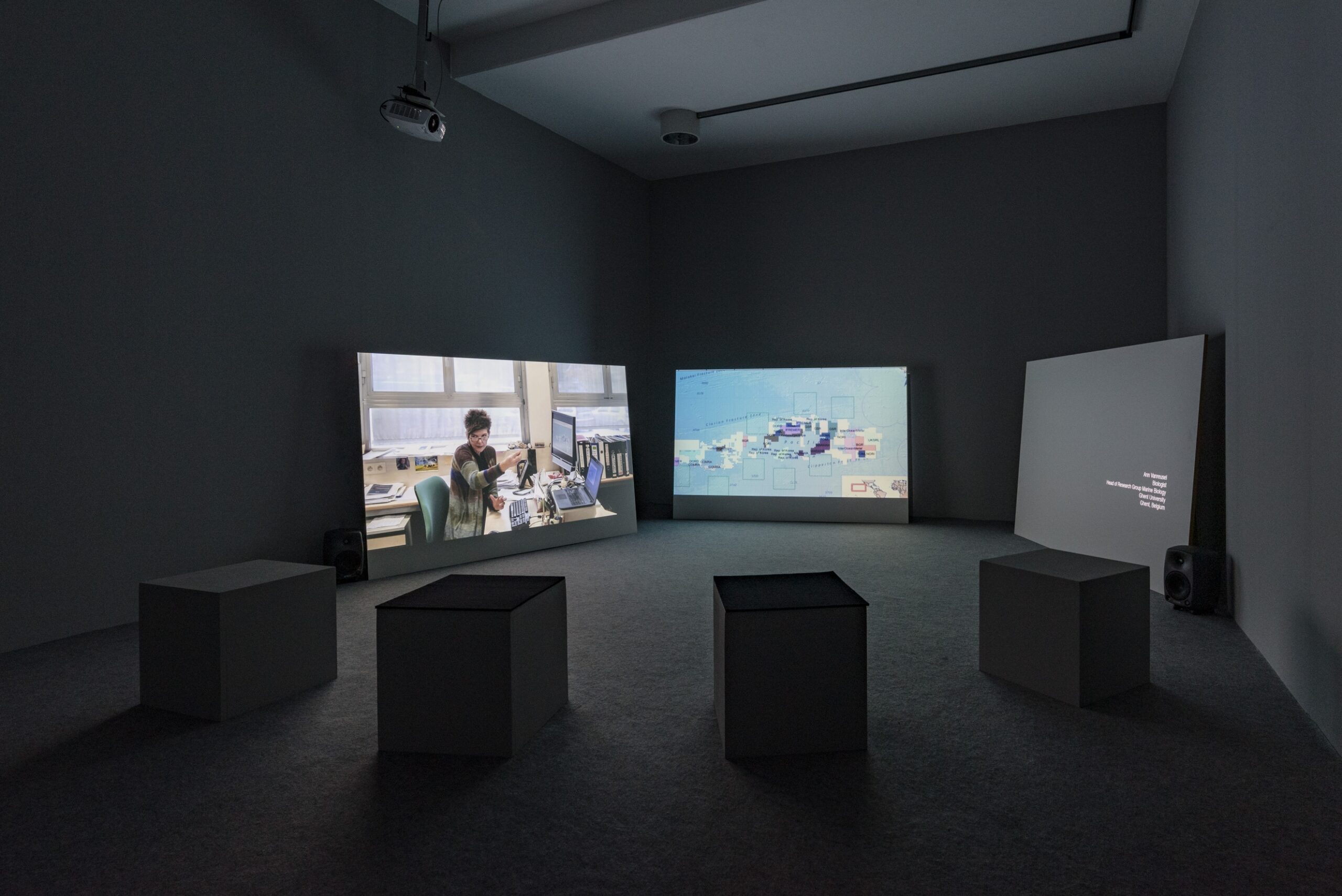 In collaboration with the video archives of the GEOMAR, Helmholtz Centre for Ocean Research Kiel and Marum, Center for Marine Environmental Sciences, Bremen, Armin Linke edited film footage from several scientific expedition where high-tech underwater Remote Sensing Vehicle was used. The operational images edited in a four-screen immersive composition presents the ROV Footage as a choreography, where the video-camera and the complex geological and biological operations of robotics arms, at a depth of often deeper than 5000 meters operate, like extensions of the pilots and the body of the scientists in a suspended and distant space. The idea of an empty deep water oceanographic space is contradicted by the encounters mediated through the visualization technology.