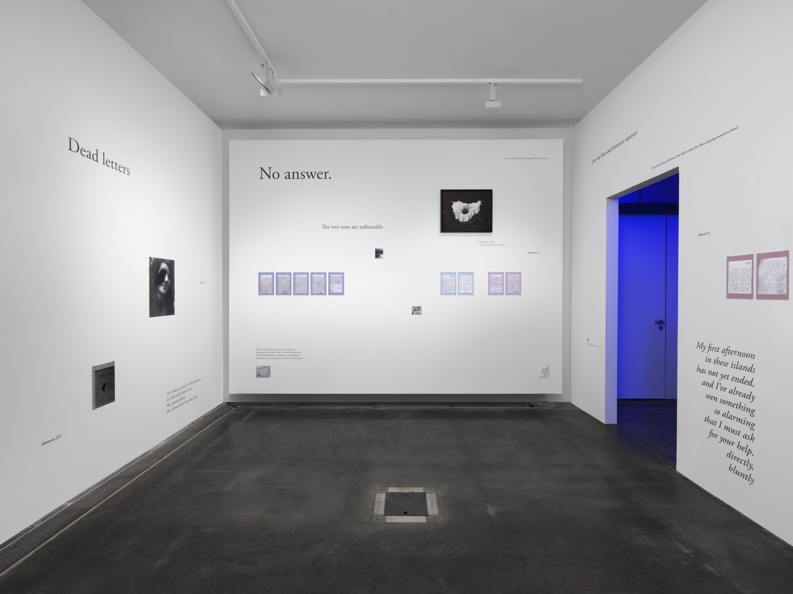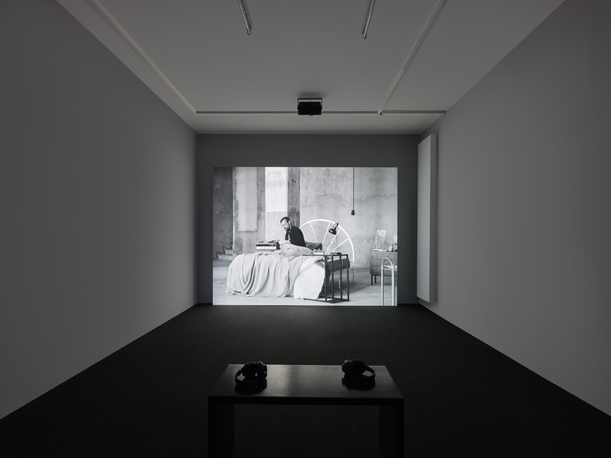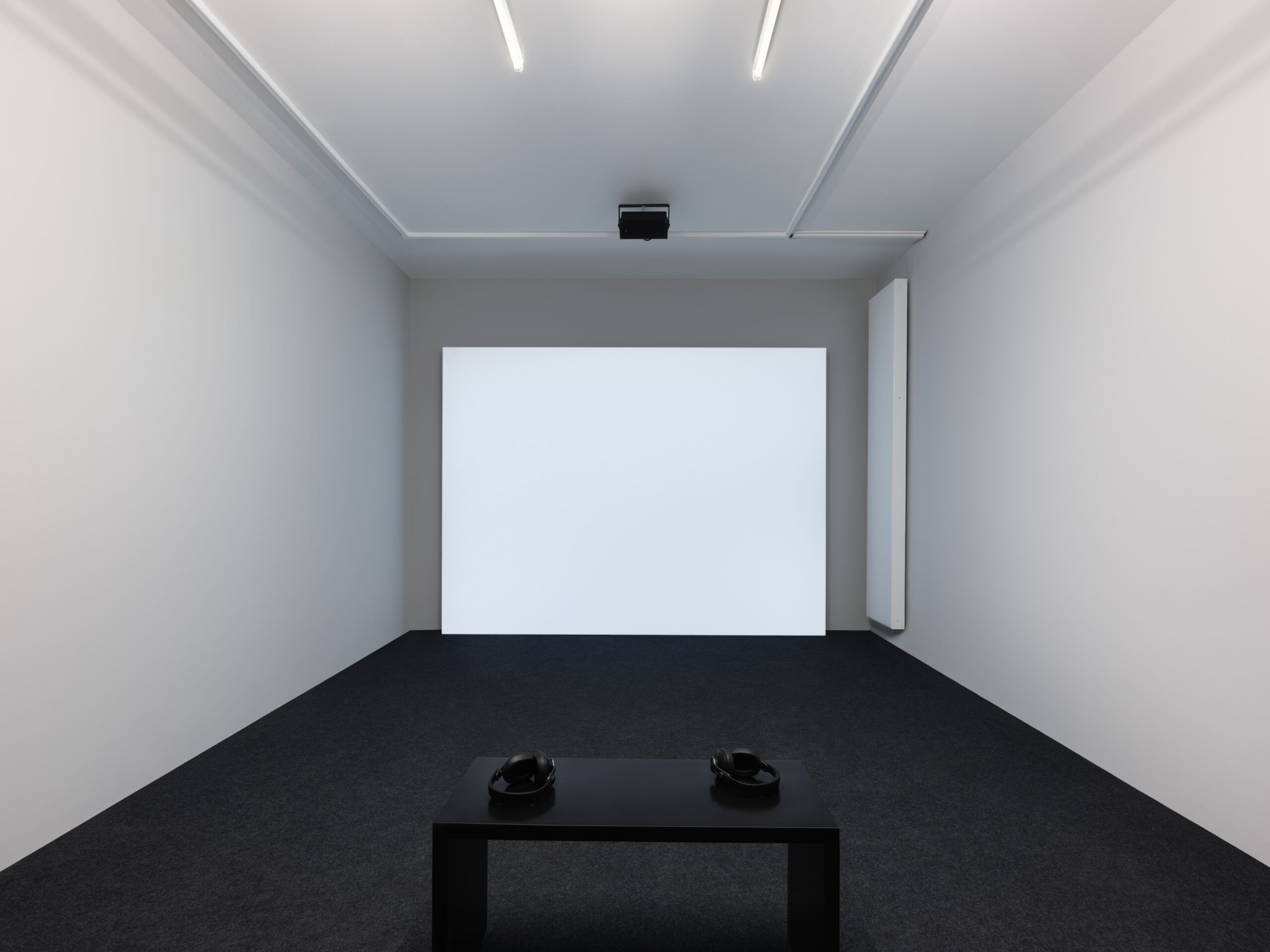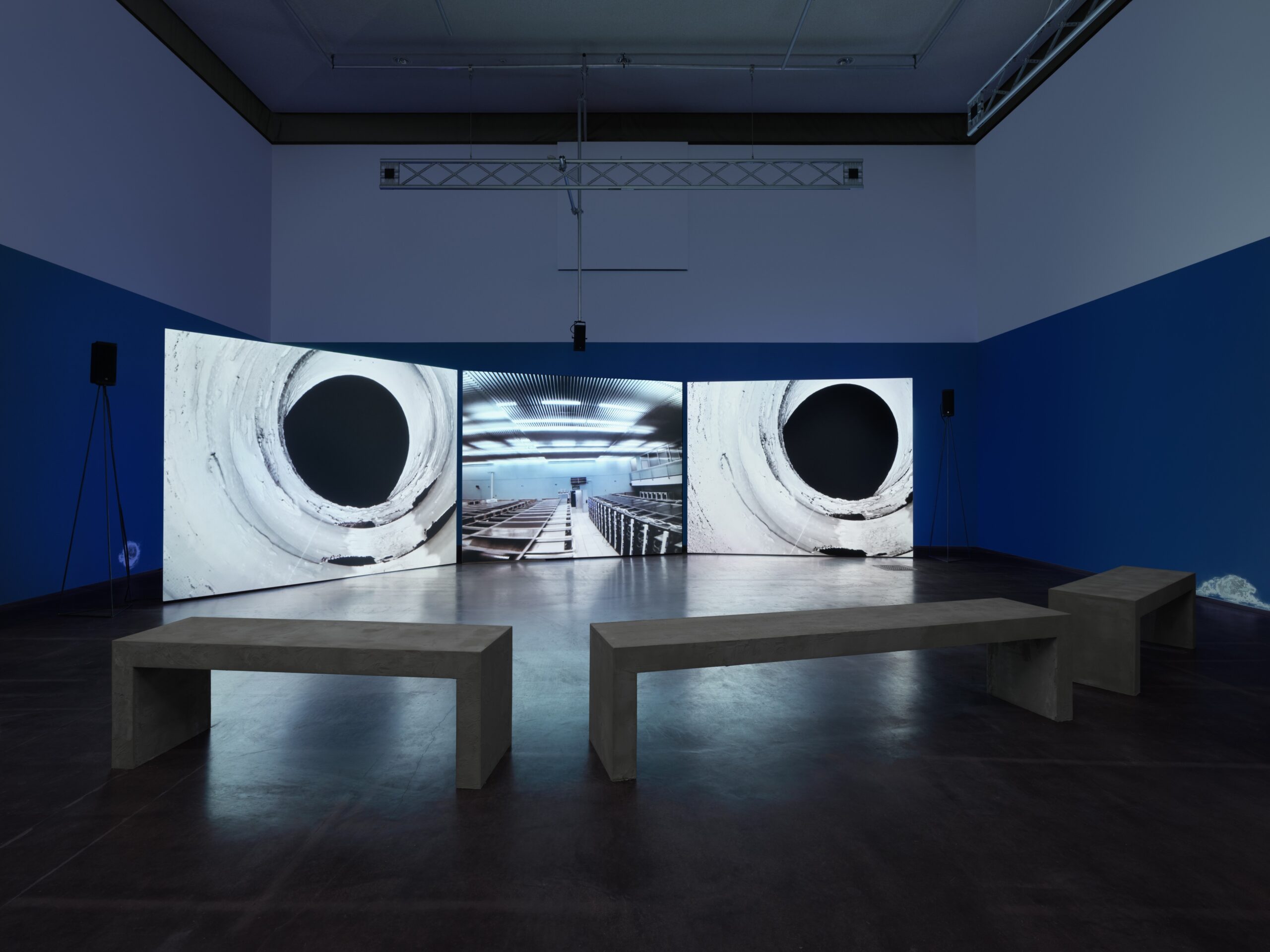 James Newitt’s solo presentation premieres the large-scale three-channel video installation HAVEN (2023). This newly commissioned piece, around which the exhibition revolves, is a poetic reworking of a bizarre story about an abandoned World War II gun tower located in the North Sea. It has been occupied since the 1960s by a British family, who claim the artificial territory as their property, independent from all state powers.