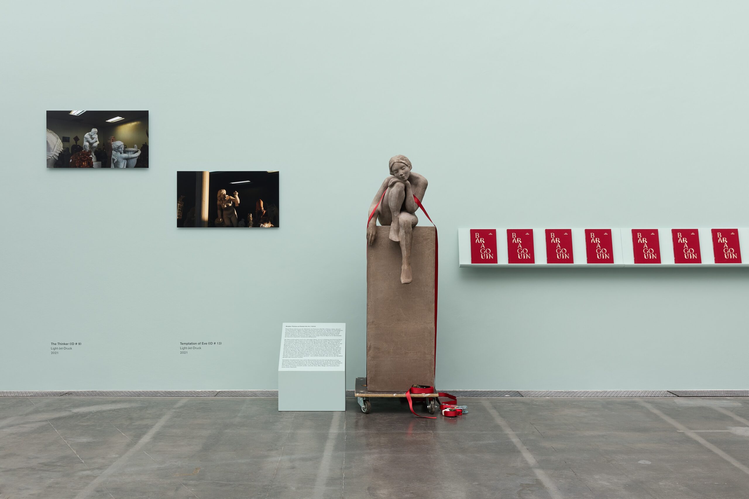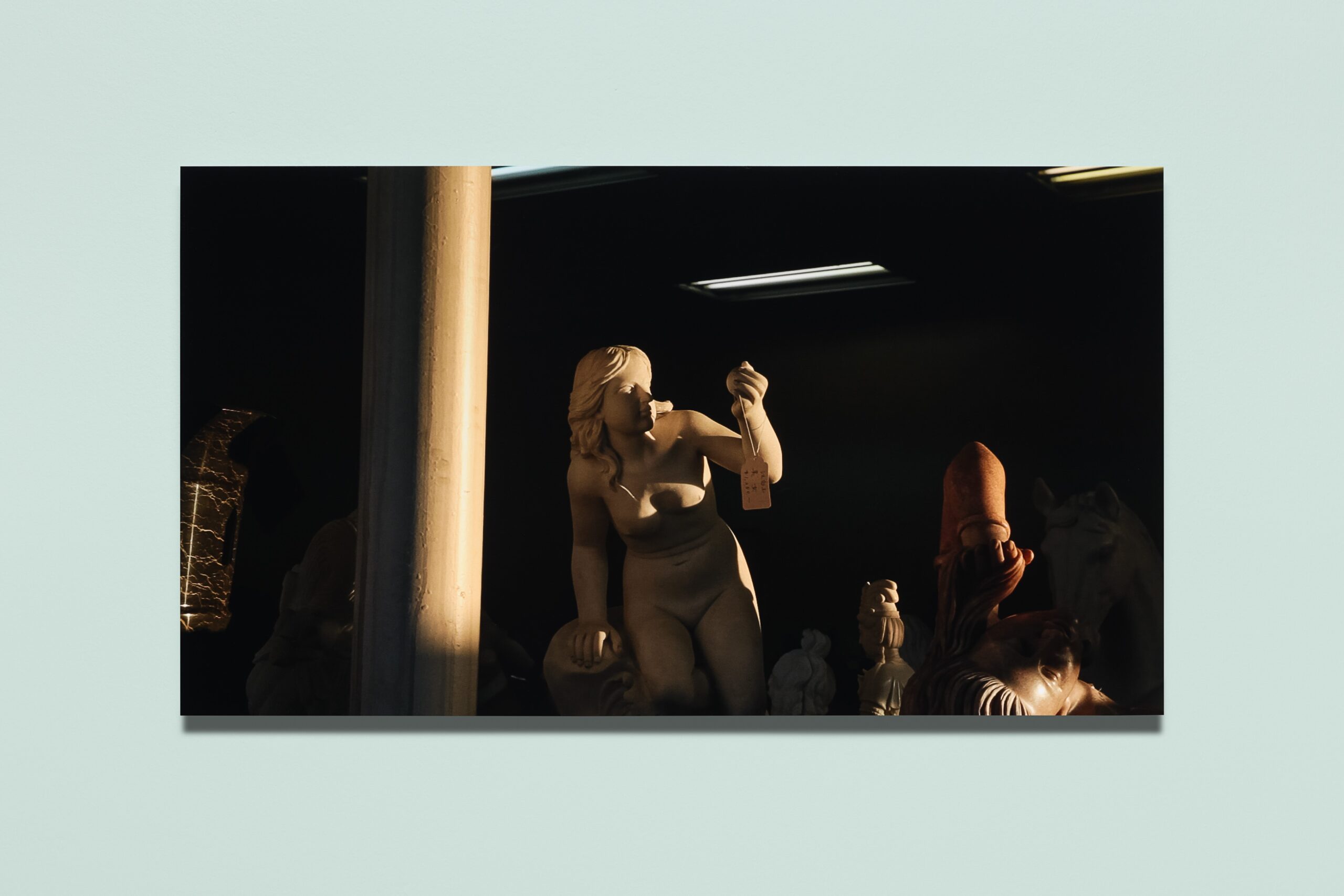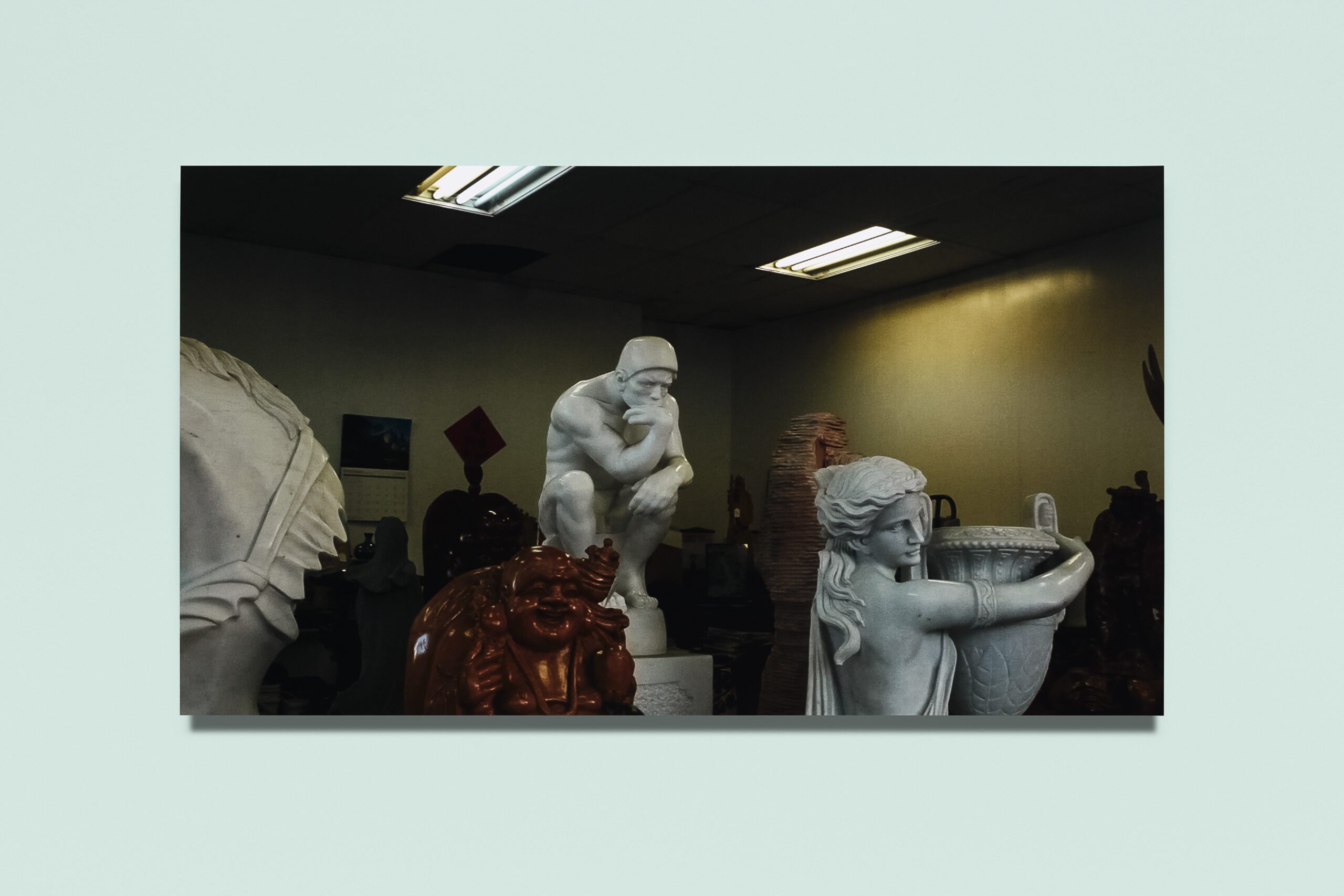 The exhibition was inspired by Kim Schoen’s newly commissioned work Baragouin (2021). Having explored the topics of nonsense and repetition for years, Schoen premieres this most recent experimental installation—named after the French term for “unintelligible jargon”—as part of Language for Sale. Baragouin gives voice to objects the artist filmed in a commercial showroom in Los Angeles that sold copies of sculptures ranging from Buddhist to Rococo and neoclassical to modernist. Working with the assumption that international commerce creates a lingua franca of its own, Schoen mounts a “nonsense opera” in which the knockoff sculptures appear to “speak” in voices relating to the provenance of their assumed originals.