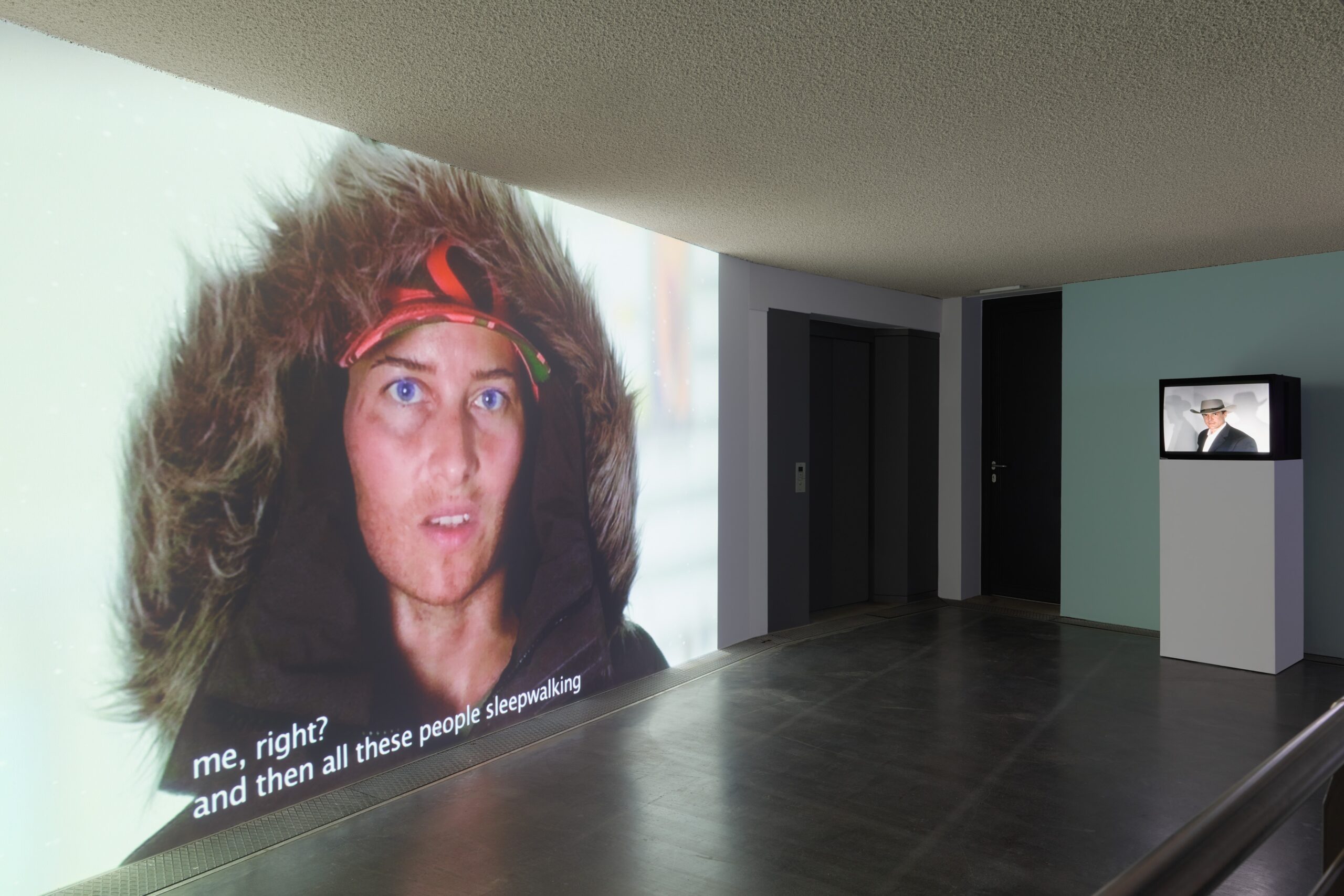 Stefan Panhans makes elaborate video pieces whose sets are worked out in meticulous detail while their protagonists’ actions are kept to a bare minimum. In Sieben bis zehn Millionen (Seven to ten million) 2005, a young man sporting hip-hop headwear and a fur-lined hood stares into the camera, as if in a music video, while performing a hysterical staccato monologue reporting on the predicament of purchasing an unnamed digital device. He bemoans the exhausting “labor of consumption”—the daily bewilderment and surges of paranoia wrought by the electronics market, elevating the purchasing decision to an existential one that is all but religious in status.