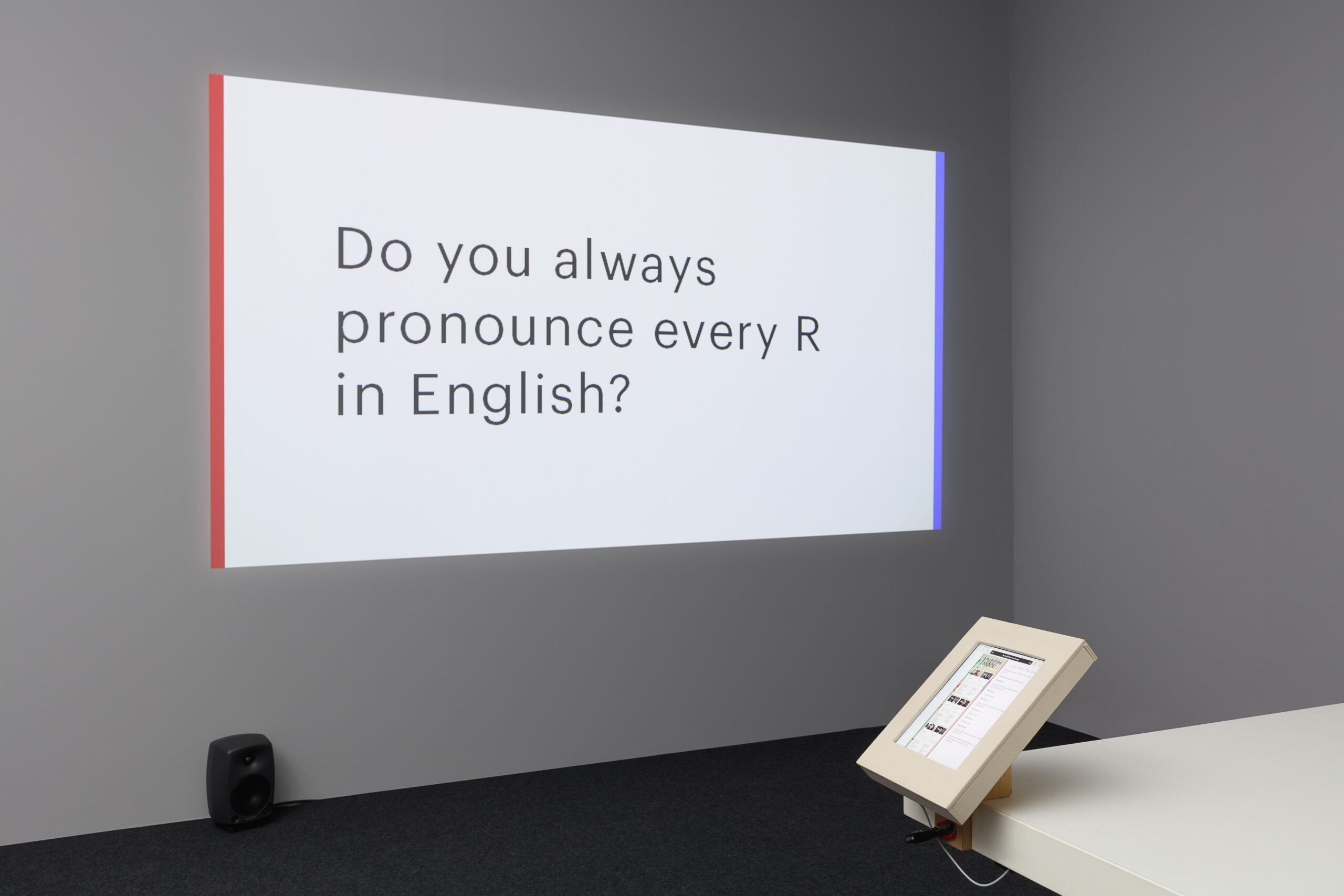 The ever-changing status of the dominant language of global exchange—that is, the English language—is at the center of Nicoline van Harskamp’s video English Forecast (2013) and the “Massive Online Open Course” project Englishes Mooc (2019−). English Forecast, presenting a performance and interactive media piece commissioned by Tate Modern, London, follows a team of four actors reciting what van Harskamp has identified as the possible future sounds of the English language. The dialogue, pinched from actual conversations, sways disjointedly from welcoming acceptance to words of caution. Noting the threat a dominant lingua franca poses to other languages, the artist suggests the work is as much “a discussion about the preservation of languages” as it is about their adaptation and potential disintegration. Englishes Mooc is an online course developed for young art makers and their audiences. It wants them to stop measuring their English along a ‘native’ standard in the international realm. When adapted according to the needs of its users, new varieties of English can emerge. The project helps to develop practical skills towards this with pre-recorded lectures and with a platform for live discussion.