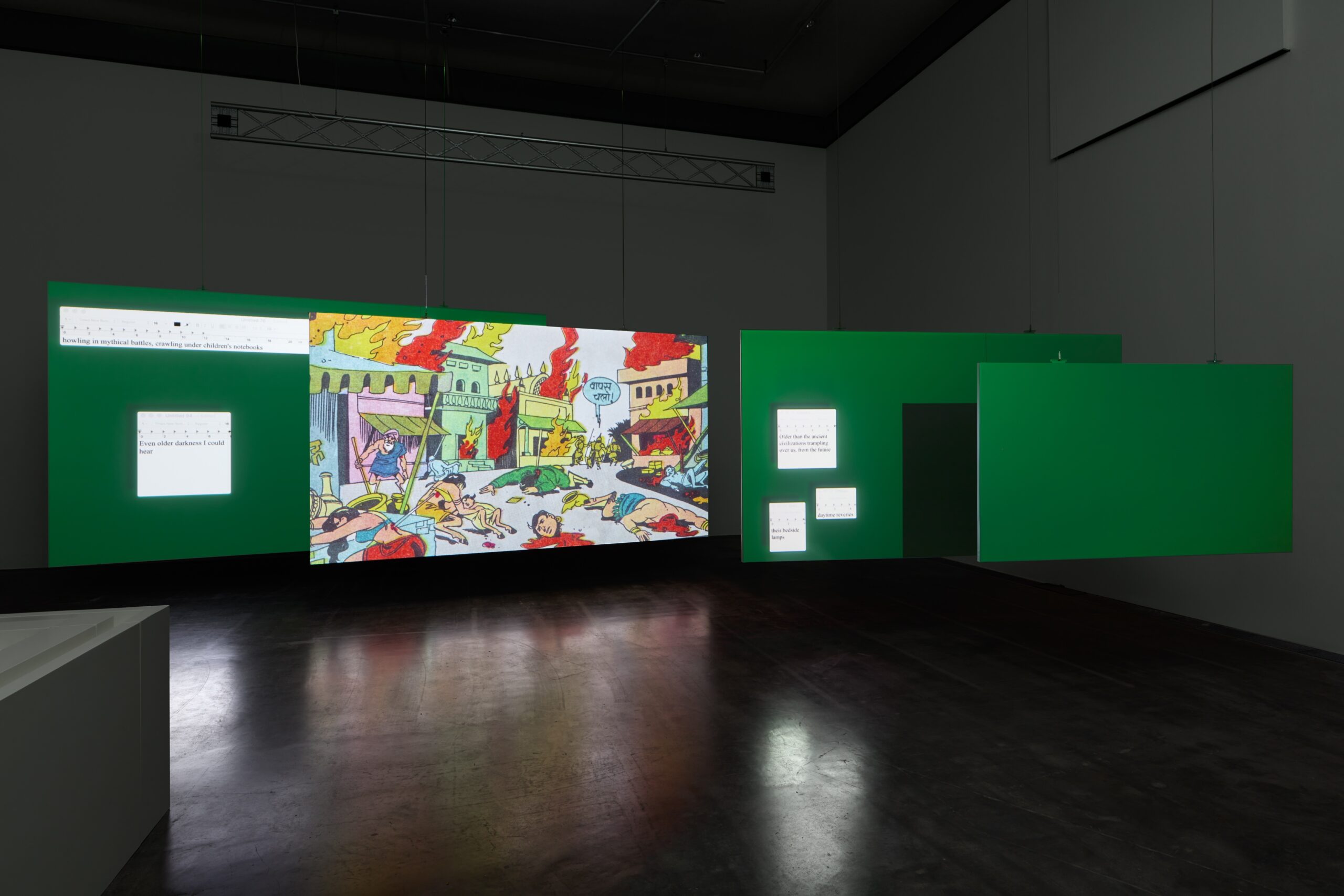 Primarily characterized by anxiety related to the imagined decline of the West and its entanglement with the rise of artificial intelligence, these subcultures engage with a distinctive techno-orientalist fantasy. Their entanglement with speculative literary genres is contiguous with the futurist urban projections of East Asia, post-Soviet Central Asia, and the Persian Gulf. Blooming as a shiny rehash of the classic Orientalist imaginary of the “Journey to the East,” these megacities, up until half a century ago, signaled a spiritual transformation of the Western subject. As an aesthetic system, the rise of internet memes epitomize this shift. Commercial capital builds a paranoid universe, relentlessly gluing together disparate extractionist tactics into a singular planetary jelly. Through a pataphysical revival of the collage aesthetic, internet memes are parasitic entities that break apart the continuous superconductivity of smooth capitalism, while feeding off the acceleration implicit in their source materials. Even at a structural level, this form of parasitism replicates the current financial-logistical cycles under which most industrial production has largely been outsourced to the Global South. However, unlike the jaded political promises of the pixelating documentary imagery of the past, the flamboyant degradations in memetic matter offer no definitive political commitment, as it is constantly dependent on its hosts’ sleek density and hideous confidence. The pervasive politics of mockery on the internet, with a kind of hieroglyphic thinking, then becomes also a mockery of politics itself, attuned to the logic of defacement wherein sacredness itself is paradoxically preserved through acts of sacrilege and defilement. Through a corruption of 3D real-estate renderings, Bollywood sounds, martial-arts games, and mythological comics, GROTESKKBASILISKK! MINERAL MIXTAPE looks at various historical instances of the strange complicity between the techno-futurist desire to eliminate politics and its duplicitous tolerance of—and perhaps even obsession with—humorous, low-resolution worlds. In the course of this history appear lost faces, defiled statues, anime chatrooms, demonic cats, and pestilential affect-objects. GROTESKKBASILISKK! MINERAL MIXTAPE will be extended into a publication by Edith-Russ-Haus in collaboration with Sternberg Press in 2023.