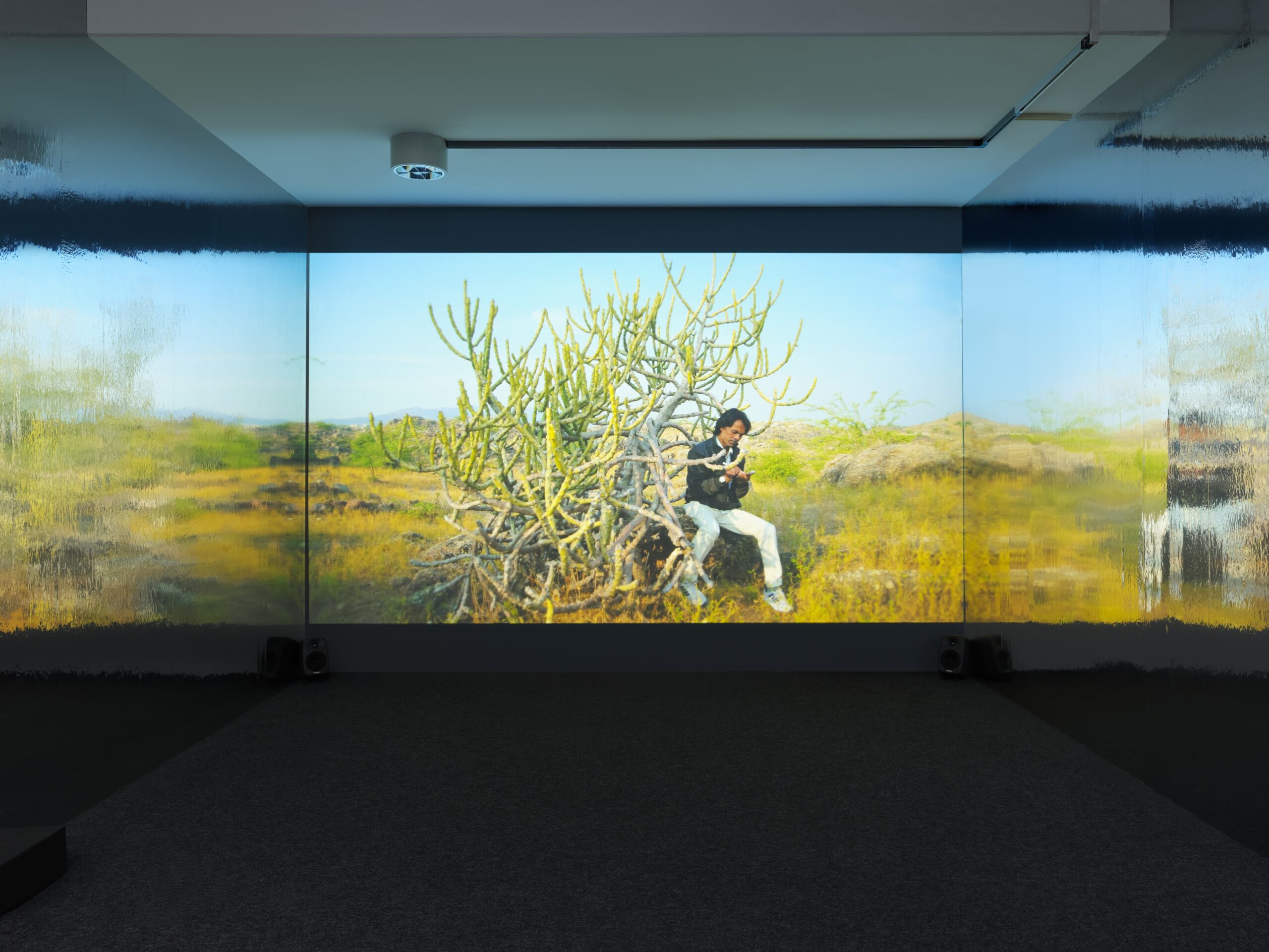 Sentient Picnic also includes Mochu’s video Cool Memories of Remote Gods (2017), set among the remnants of hippie trails in India. The video draws from the history of 1960s counterculture groups and their use of spiritual ideas as a phenomenon contemporaneous with the development of the personal computer and cybernetics. No longer as active as they once were, these trails still bear the signs of the techno-fictional—overlaid with ancient spiritual regimens. At that time, as computers proposed that machine activity could replace the mind, counterculture considered whether religious or mystical experience could be recreated through technical means, as customizable “internal technologies.” However, this imagined “Empire of Equilibrium” has now been reduced to psychedelic posters, cheap copies of surrealist paintings, and new age fusion music. The hippie trails and their symbolism reveal a decaying corpse, yet one that has a propensity toward some kind of vampiric animation. The politics of such an animation and its resurrectionary special effects, besides being the central schematic of this video, also pave the way to revising notions of sentience, intelligence, and thought in relation to the technological imaginaries explored across the exhibition. The exhibition’s title, Sentient Picnic, while keeping in mind the absurdist wasteland of the influential 1972 Soviet sci-fi novel Roadside Picnic, also evokes this broader scenario wherein the weight and finitude of materials, artifacts, and effects are inseparably entangled with abstract thought.