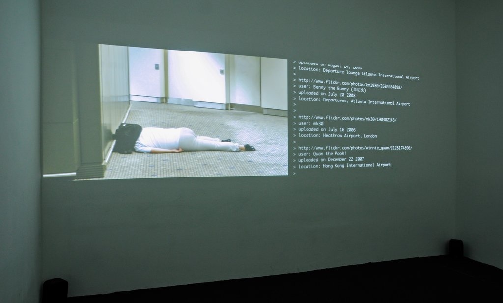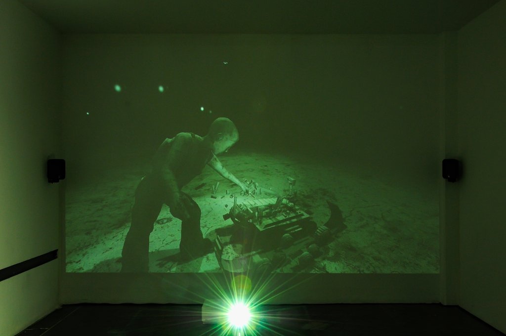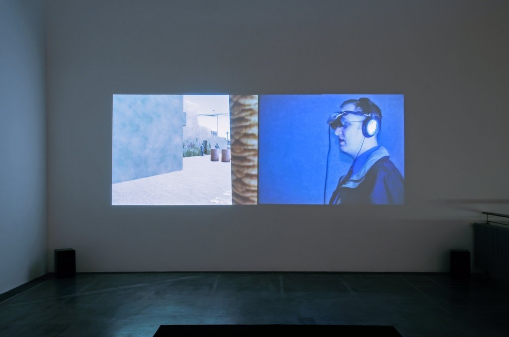 In the second thread of the exhibition, artists directly engage with the way in which web technologies have infiltrated and influenced global wars. Joseph DeLappe uses an online recruiting game of the American army to write down the names of killed American soldiers in Iraq. Thompson & Craighead construct a global narrative of an ubiquitous war from blog information. Oliver Laric shows airbrush variations of a manipulated Iranian image of rocket launches which was widely faked and ridiculed on the internet. Knowbotic Research offer a fictional ending to a moving YouTube-circulated news story, where a young Palestinian boy turns into a Transformer-like robot. Harun Farocki addresses the question of computer-aided trauma therapy for war veterans.