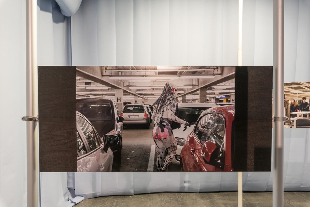 In Johannes Paul Raether’s installation, a “psycho-realist” lifeline of characters Transformella, Queen of Debris and Transformalor, Surrogate Mother of the Institute for Reproductive Futures take residence at the Edith-Russ-Haus. The figures at the center of the installation are several of the multiple “AlterIdentities” that emerged from Raether’s cyclical system of performances as embodiments, materializations, and visualizations of social paradoxes and catastrophic political actualities. As “Research Avataras,” Transformella/or are dedicated to the assertion of the emancipatory potential of biomedical innovation in the field of assisted reproductive technologies.