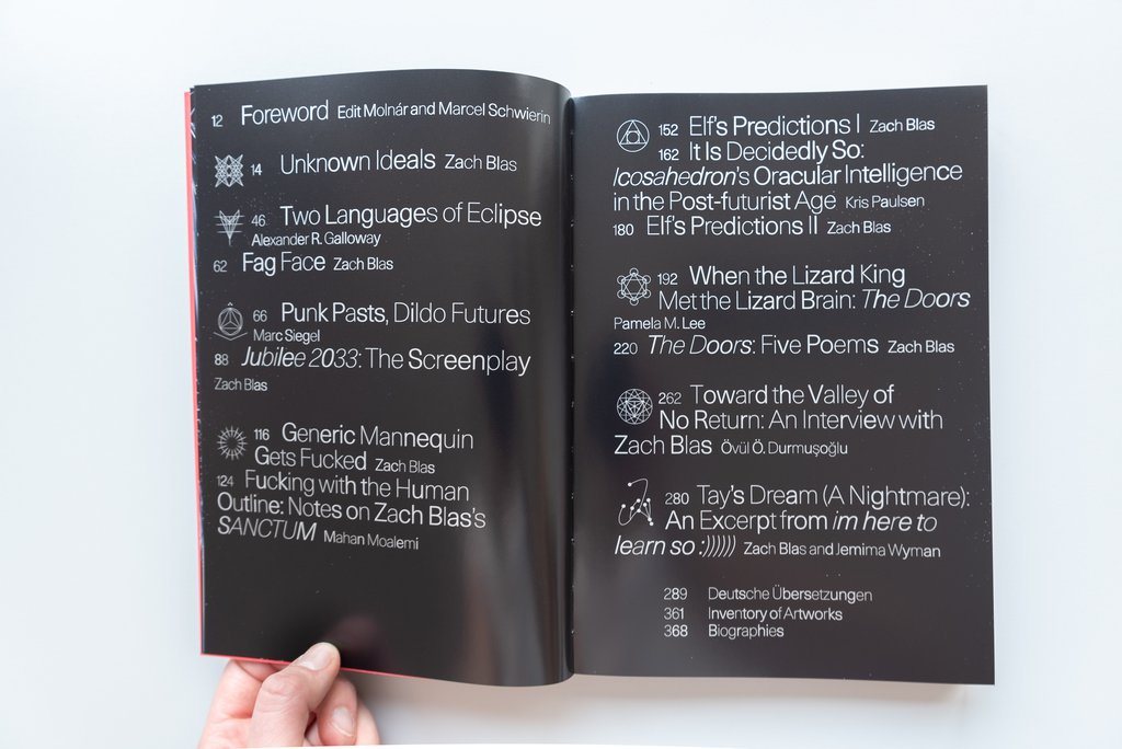 Diese Publikation bietet eine Untersuchung der einzigartigen Praxis von Zach Blas durch eine Reihe von neu in Auftrag gegebenen Essays von Alexander R. Galloway, Pamela M. Lee, Mahan Moalemi, Kris Paulsen und Marc Siegel, ein Interview mit Zach Blas von Övül Durmuşoğlu und Schriften des Künstlers selbst. Diese aufschlussreichen Beiträge erweitern die technologischen, queeren, filmischen und kulturellen Untersuchungen, die die reiche Welt von Blas’ Praxis ausmachen, die für seine Generation von digitalen Künstlern beispielhaft ist.